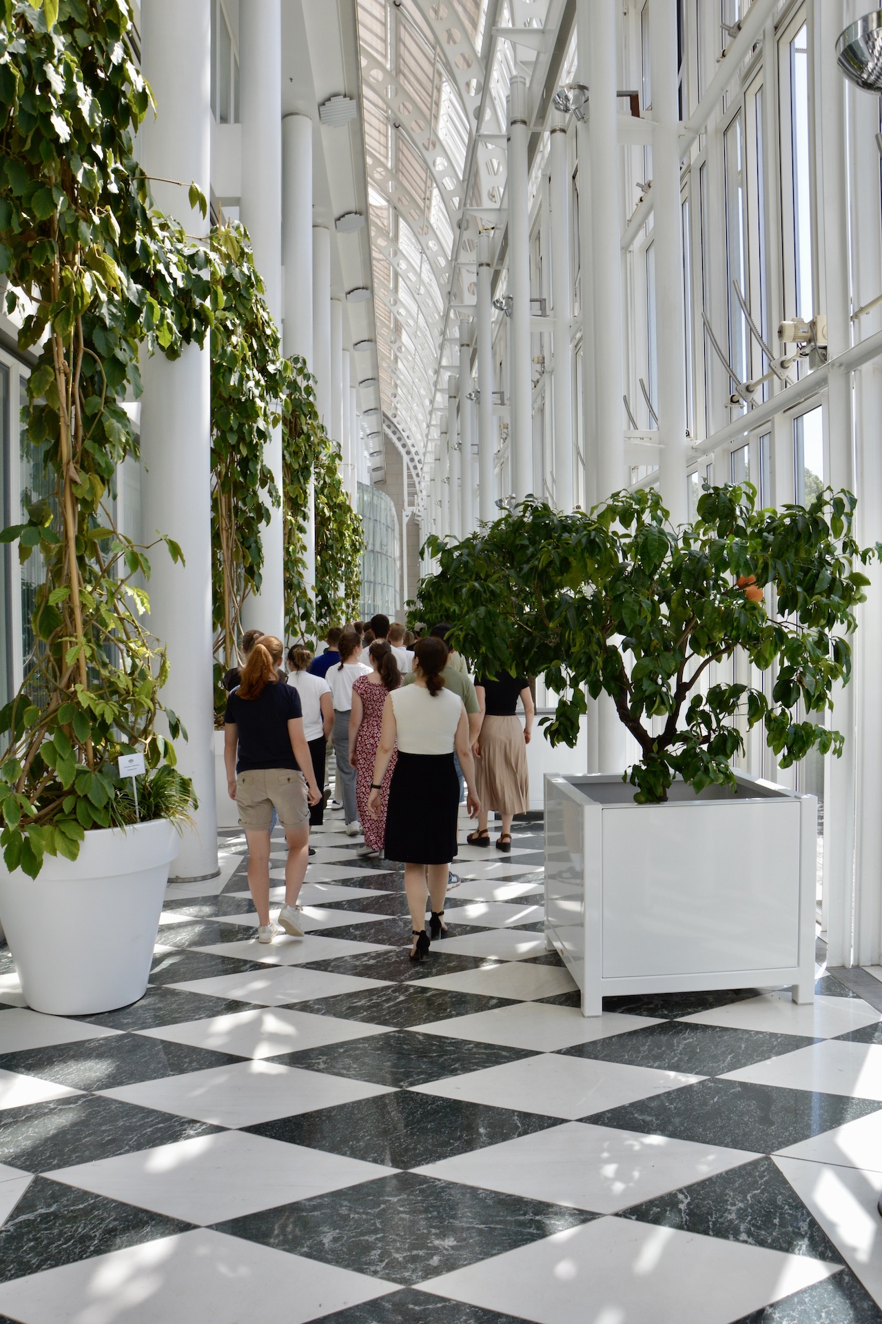 Nach der Anreise wurden die 27 Schülerinnen und Schüler und ihre zwei Begleitlehrkräfte am Kultusministerium mit einer Brotzeit begrüßt und erhielten dann in einem Fachvortrag Einsicht in die Struktur und die Aufgaben des Staatsministeriums für Unterricht und Kultus. Diese Kenntnisse wurden dann spielerisch gefestigt und vertieft. Besonders aufregend war dann der Gang in die „heiligen Hallen“ des StMUK: das Vorzimmer und persönliche Büro der Ministerin Anna Stolz! Hier konnte der Kurs nicht nur hautnah erleben, wo die Ministerin arbeitet, sondern einer engen Mitarbeiterin auch Fragen stellen. Zum Beispiel konnten die Kursteilnehmer erfahren, wie lang ein Arbeitstag von Frau Stolz ist, welche Termine die nächste Arbeitswoche für sie bringen wird oder wie viel Entscheidungsmacht z.B. über schulische Fragen bei der Ministerin liegt. Danach stand vor dem Mittagessen in der hauseigenen Kantine ein weiterer Fachvortrag zur politischen Bildung an, der von den interessierten Fragen und Beiträge der Schülerinnen und Schüler begleitet wurde. Am Nachmittag machte sich der Kurs bei bestem Wetter zu Fuß auf den Weg in die Staatskanzlei. Dort erhielt der Kurs eine Führung durch das Gebäude mit zahlreichen Informationen zur Erbauung und Nutzung. Das Highlight kam aber zum Schluss: Sogar der Ministerratssaal war für die Schülerinnen und Schüler geöffnet, sodass sie auf den Stühlen von Ministerpräsident Söder und den weiteren Ministerinnen und Ministern Platz nehmen konnten, während sie erfuhren, wie Ministerratssitzungen ablaufen.