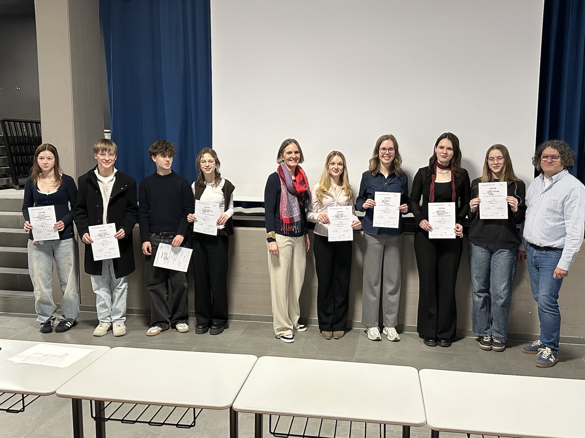 Für das MMG debattierten Veronika Kollmer und Jonathan Kuchler in der Altersgruppe I. Sie mussten sich in den Vorrunden damit beschäftigen, ob man zu einer Tierkrankenversicherung verpflichtet werden sollte und ob auf allen öffentlichen Plätzen in Niederbayern kostenloses WLAN angeboten werden sollte. Jonathan Kuchler konnte sich hier behaupten und kam ins Finale: "Soll für Privatgärten eine insektenfreundliche Gestaltung vorgeschrieben werden?" war hier die Frage. Jonathan landete auf dem undankbaren dritten Platz, denn nur die beiden Erstplatzierten kommen zum Landesfinale nach München.