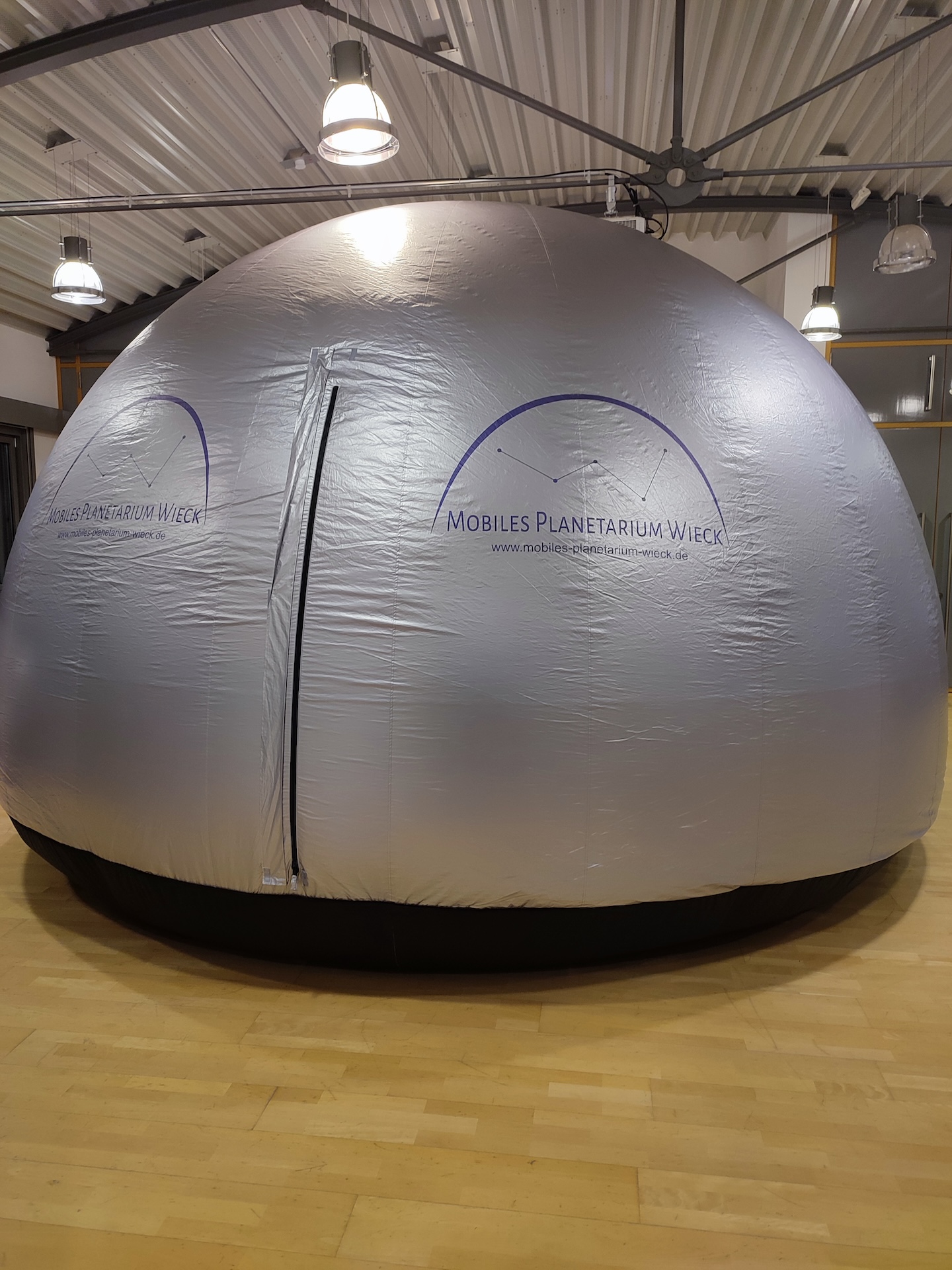 Zuerst mussten die Schüler durch einen engen Eingang steigen, um in die große Kuppel, mit einem Durchmesser von 5 Metern zu gelangen. Das aufblasbare Planetarium bietet auf einer Fläche von knapp 20 m² und einer Höhe von 3,20 m genügend Platz für eine ganze Klasse, um mithilfe eines 360°-Projektors den Nachthimmel zu betrachten und die Sternbilder kennenzulernen.