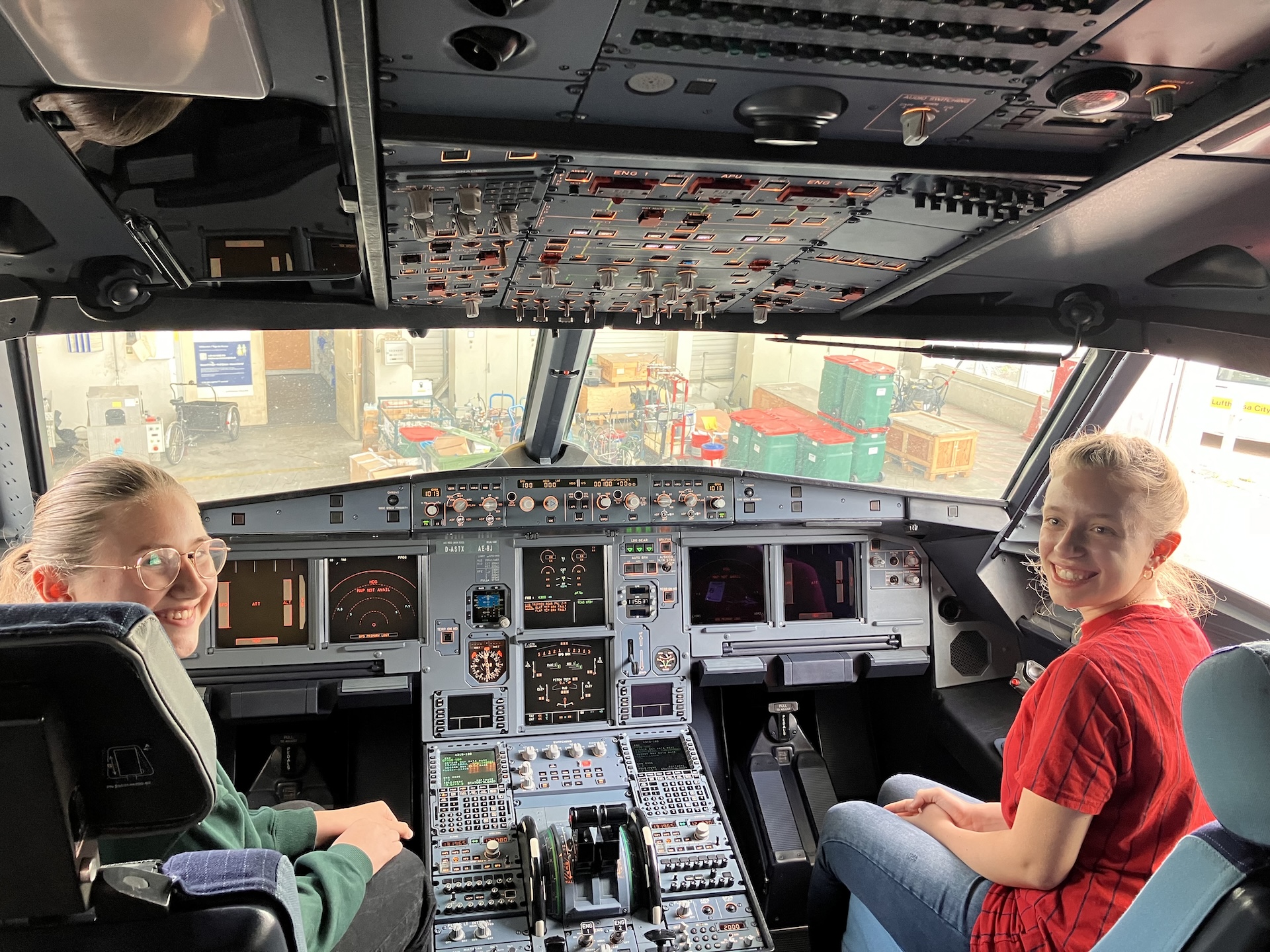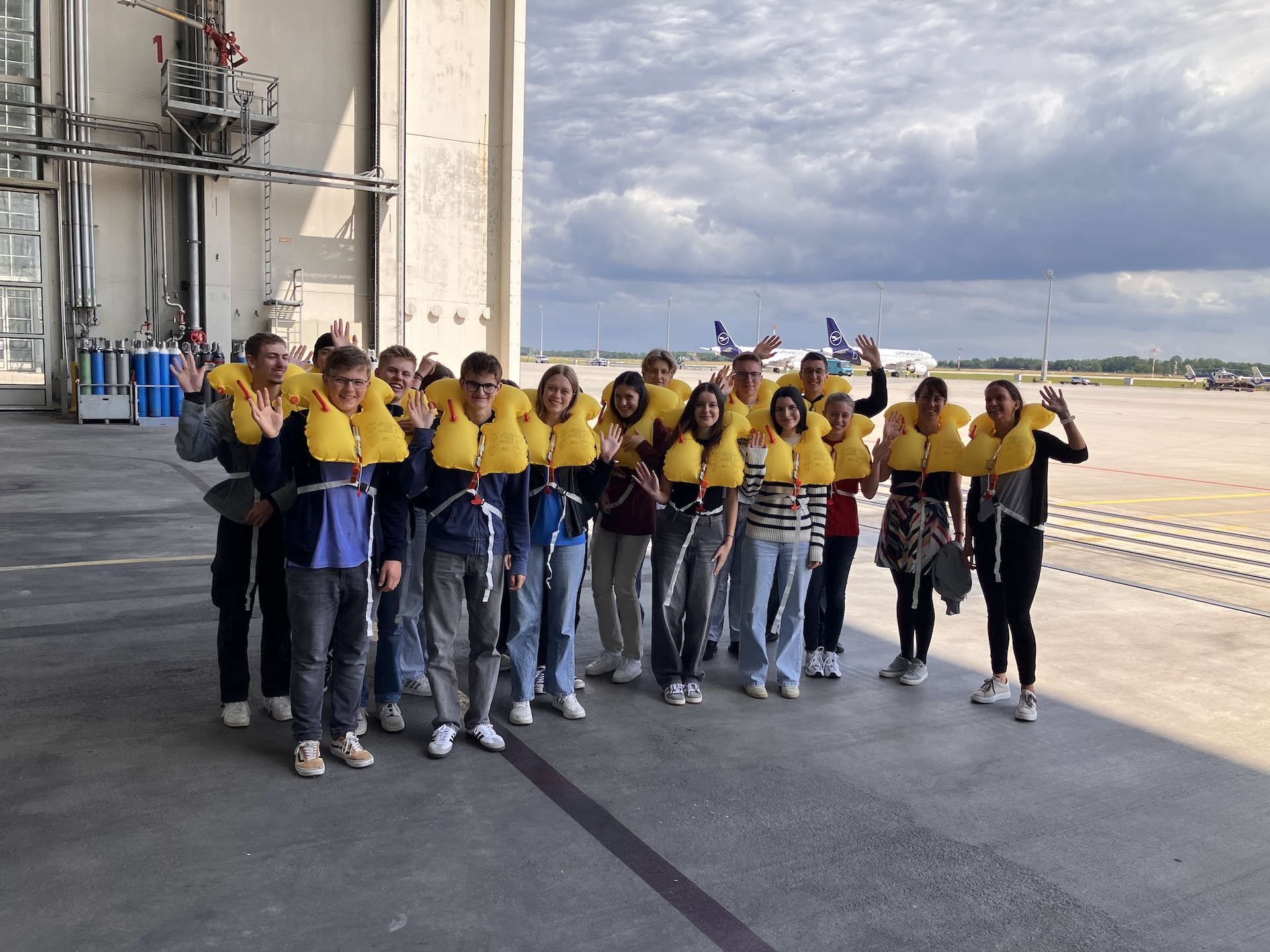 Cockpit-Einweisung, Platznehmen auf den Piloten-Sitzen, Schwimmwesten-Übung – der Besuch des P-Seminars Geographie bei der Lufthansa City Line Technik im Erdinger Moos bescherte den Schülerinnen und Schülern einige unvergessliche Erlebnisse. Im Vordergrund standen aber die Informationen rund um Berufe in der Luft- und Raumfahrttechnik. So informierten der Technikleiter, die Abteilungsleiter der Bereiche Engineering, Maintenance, Commercial und Training über Ausbildungs- und Studiumsmöglichkeiten in diesem Bereich. Anschließend zeigten uns mehrere Ingenieure und Techniker den Arbeitsgegenstand, einen Airbus 319, beantworteten Fragen und steckten uns mit ihrer Begeisterung für die Fliegerei an. So wissen wir am MMG nun z.B. was in der Nase eines Flugzeugs steckt.