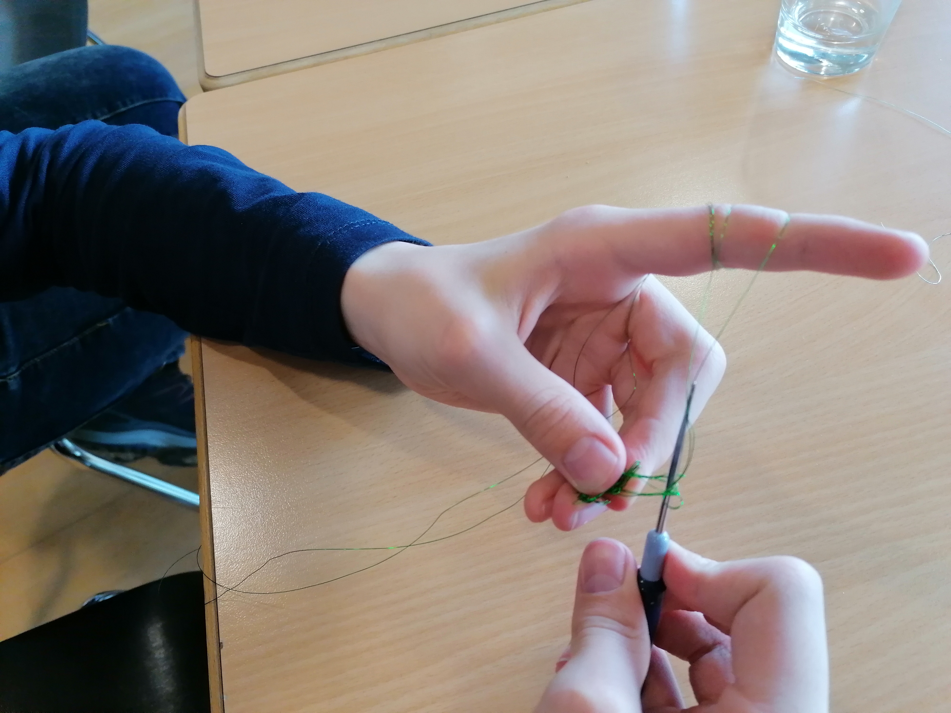 Wer hätte zuvor gedacht, dass man mit buntem Draht häkeln oder man kleine gehäkelte Scheiben durch Punzieren zu halbkugelförmigen Bausteinen für Schmuckstücke machen kann. Mit einiger Mühe war es dann geschafft. Aus dem feinen, farbigen Metalldraht wurden buntschillernde Halbkugeln. Sie konnten mit Zweikomponentenkleber zu Schmuckanhängern verklebt werden. Besonders interessant daran und der Link zur Technik war, dass die Formen aus dem 3D-Drucker kamen.