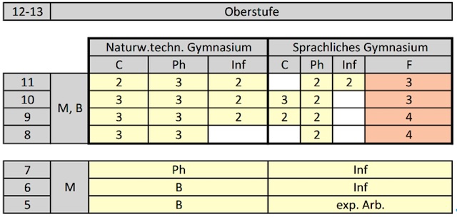 Die Stundentafel der Ausbildungsrichtungen (siehe GSO, externer Anbieter: Bayerische Staatskanzlei) wird am MMG wie folgt umgesetzt:
